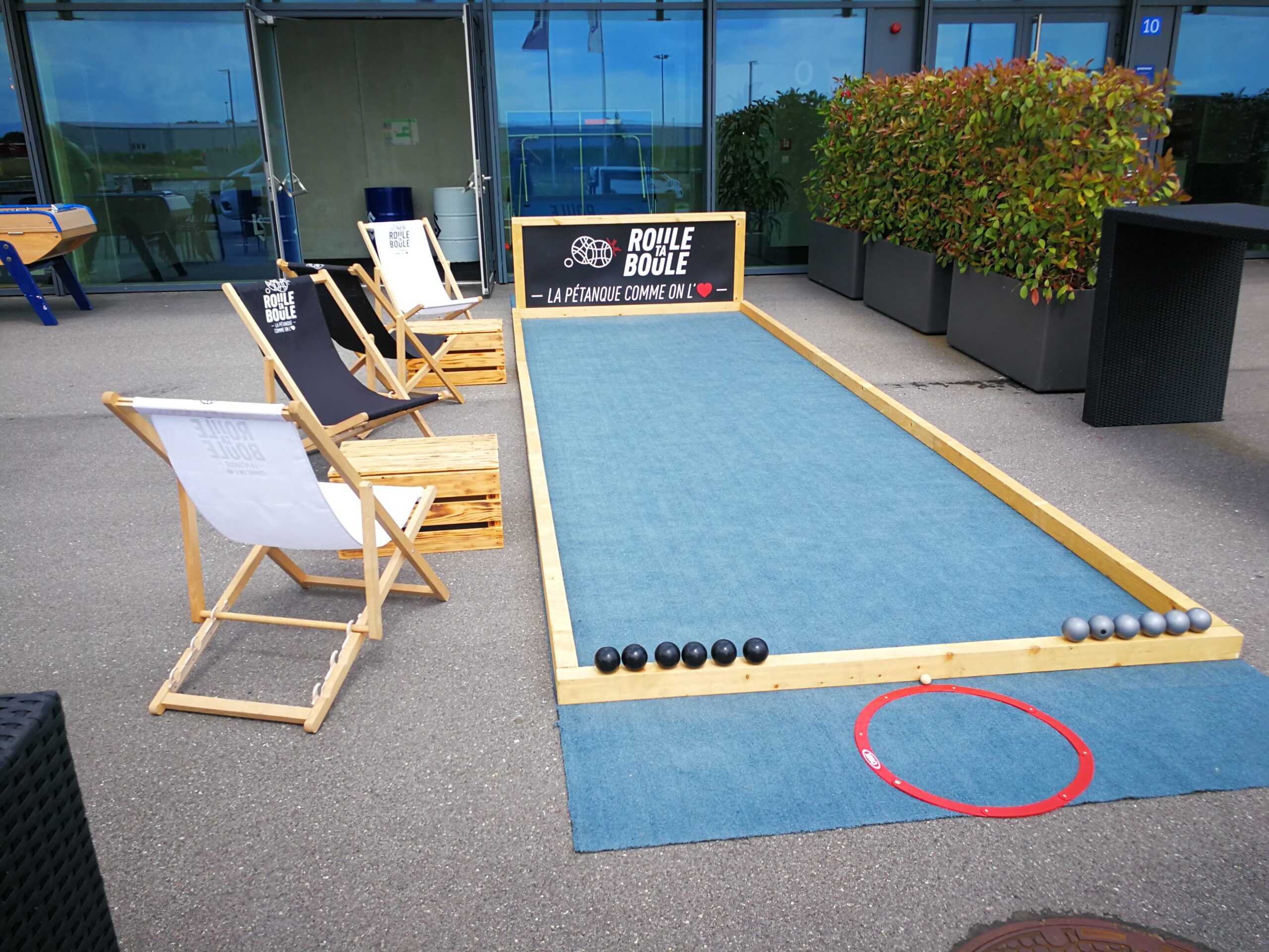- Des goodies personnalisés aux couleurs et logo de votre entreprise : Des boules souples et cochonnets aux sacs ou même votre terrain complet customisé
